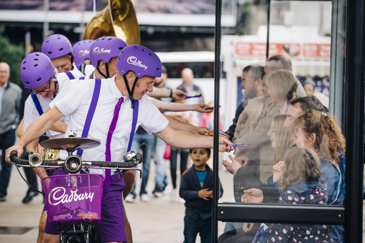 Queueing is a favourite British pastime! So how can we bring instant joy to queues across London? Roving joy-givers off course! A brass band on the six-seater ‘Joycycle’ were dispatched to deliver chocolatey goodness.